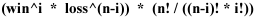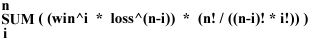 ![]() where win is the chance of winning the bet, loss is the chance of losing the bet, i is the number of wins/losses, and n is the total number of decisions. The above formula gives the result for the probability of winning i decisions out of n; to find the chance of losing i out of n, you need to switch the values for "win" and "loss". When you want to find the probability of winning i decisions or more out of n, the above formula becomes a subset of a larger calculation; since there is more than one way the outcome can occur, you need to sum over the set of probabilities from i to n: